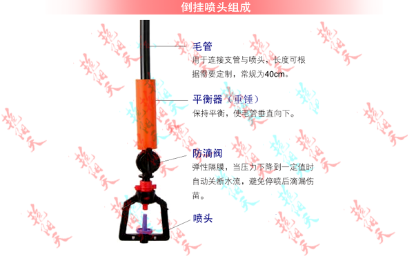 该方式除了用于灌溉外,还可以用于叶面施肥,以及绿植叶面淋洗和夏季降温等用途,广泛适用于果树、花卉、蔬菜、苗圃、草坪、温棚等多种场合。
