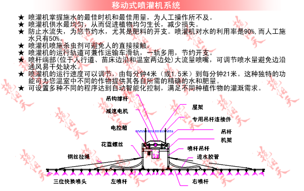 优点:节水、易实现自动控制、可以降温、加湿、调节温室田间气候。