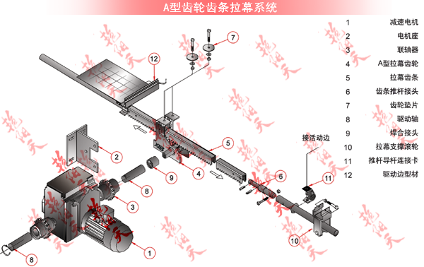 1. 齿轮齿条方式,性能稳定,分为A型与B型,A型齿轮齿条为有速比的驱动系统,较适用于大面积的遮阳网的开启与闭合。